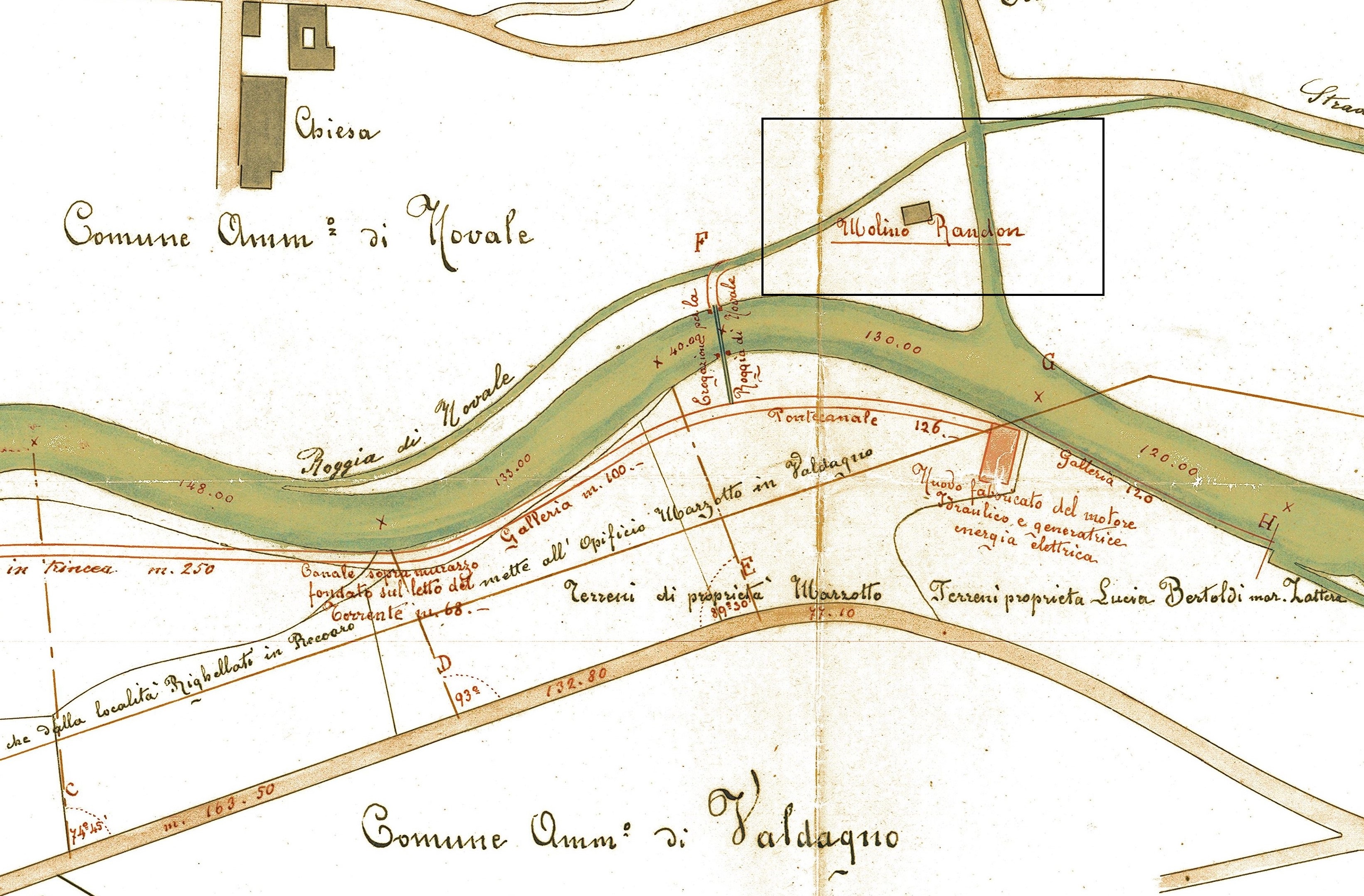 According to the 1898 Wool Mill project, a shunt channel of about 500 meters (partly in a trench, partly in a tunnel and partly on the open-air canal bridge) would convey the water to a small loading tank located above the engine building, from which a short forced conduct would feed water to a Francis turbine (built by the company engineer A. Riva Monneret & C. from Milan in 1898). With respect to this, it is worth to mention an agreement between the woolen mill and the Consortium of Roggia di Novale following damage incurred by the latter due to the fact that water was not returned from the Maglio power station to Agno as it was transferred to the Coré power plant. The company Marzotto eventually agreed to solve the problem sending a small portion of the water flowing to the Coré plant into the canal of Novale “by means of an iron sheet metal pipe suspended on stone pillars and a trellis beam, crossing the Agno river”. A comfortable, yet unsafe passageway on the Agno river: the nearby Ponte Briscola.